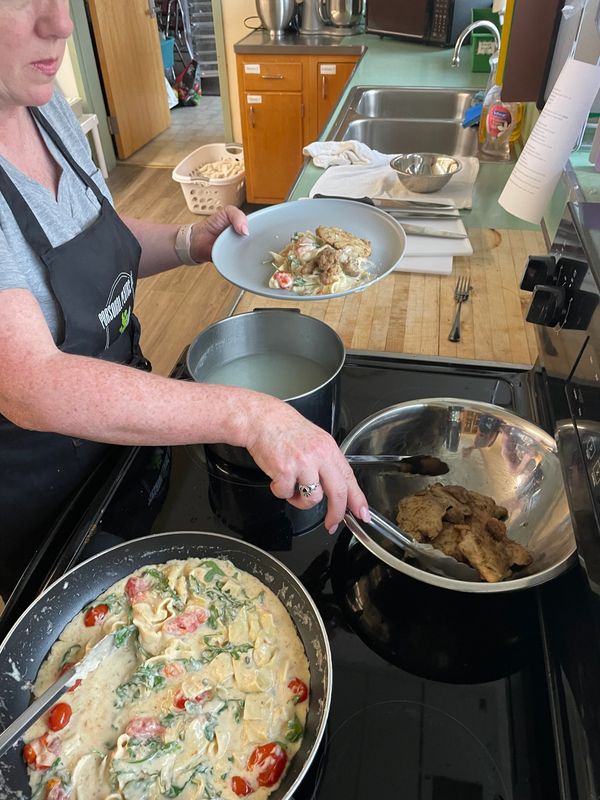 Chefs will pair off and learn how to make tortellini pasta from scratch filled with a creamy ricotta mix. While the dough is resting, chefs will prep ingredients, learn how to clean shrimp, and make pesto from scratch.