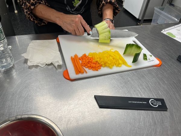what it’s called), and work on some knife skills for our roasted vegetables. Bottled water is provided however, you