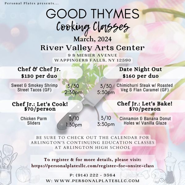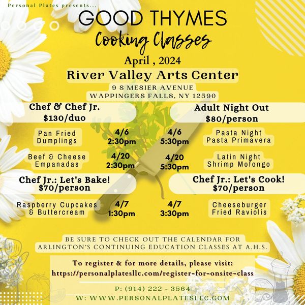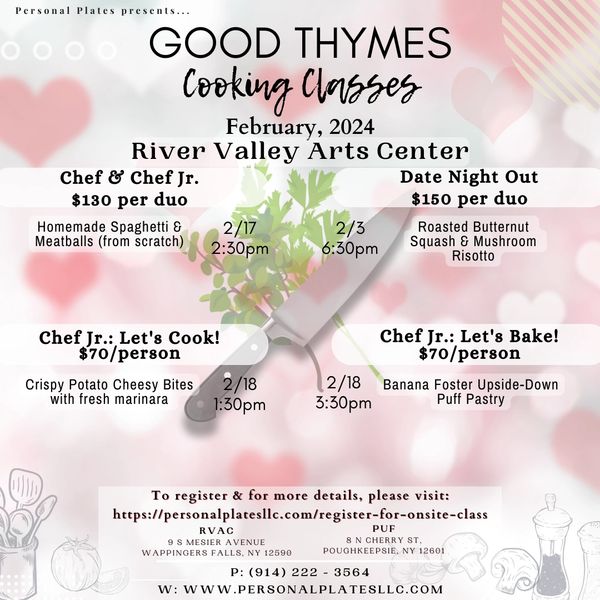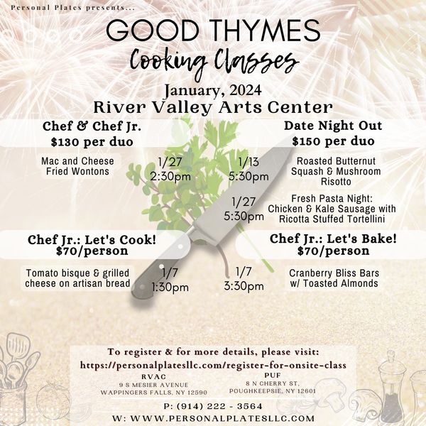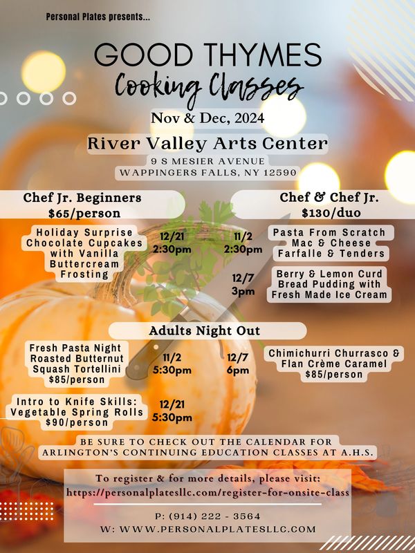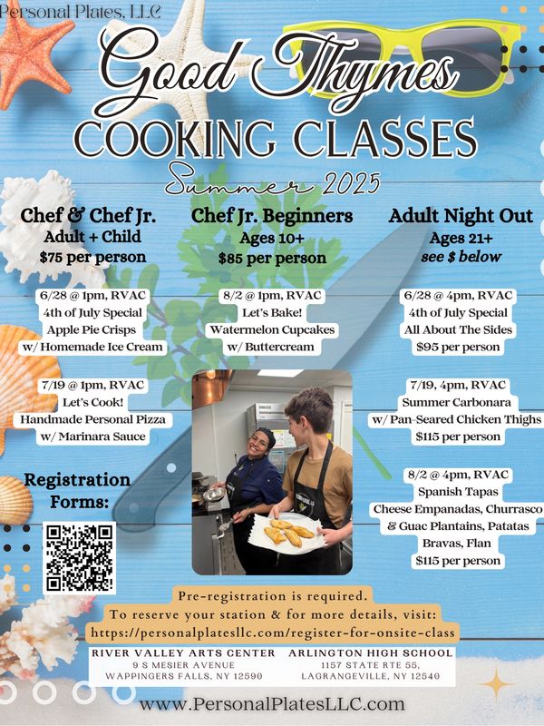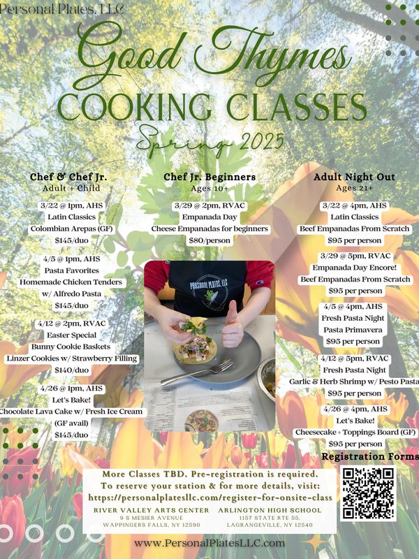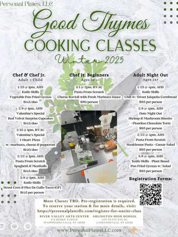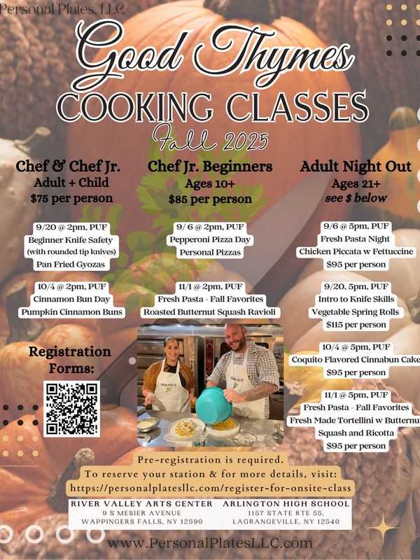 Cooking classes are taught with step-by-step guidance from Chef Gina Pagan-Vazquez, owner of Personal Plates, LLC. Each month features different classes and each require pre-registration to ensure minimum number of students are attending and proper ingredients are available. Registration link with more details and required waivers for Fall 2025: